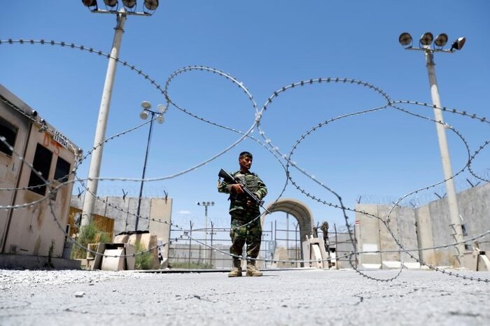 سرباز افغانستانی در مقابل درب پایگاه نظامی بگرام